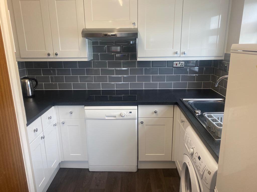 Modern kitchen with fridge/freezer, electric cooker with double oven, microwave, dishwasher, washer dryer, and fully equipped with crockery and utensils