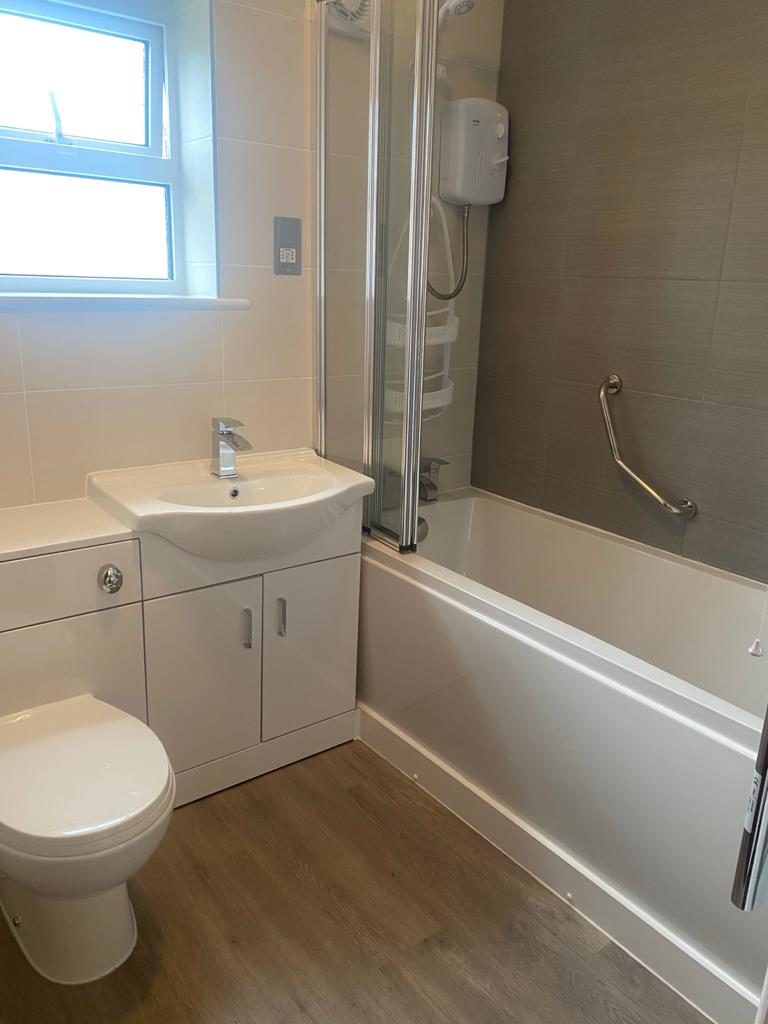 Bathroom with bath, shower, toilet and hand washbasin.