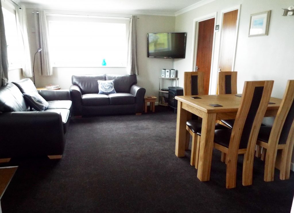 Lounge / dining room with settee, seats, table, chairs, colour television & DVD player